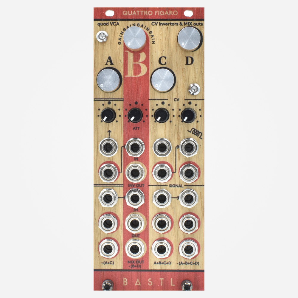 Quattro Figaro is a 4 channel VCA (voltage controlled amplifier) with one CV inverter per channel and outputs of mixed channels. Each channel A,B,C and D has its GAIN knob, CV IN jack with ATTENUATOR knob, INVERTED CV OUT, SIGNAL IN and SIGNAL OUT jacks. The signal gets amplified with gain linear to the control voltage. Control voltages above 6 volts get compressed non-linearly (property of VCA chip). Maximum gain is a little above 2. Amplified signal is outputted from the SIG OUT jack.